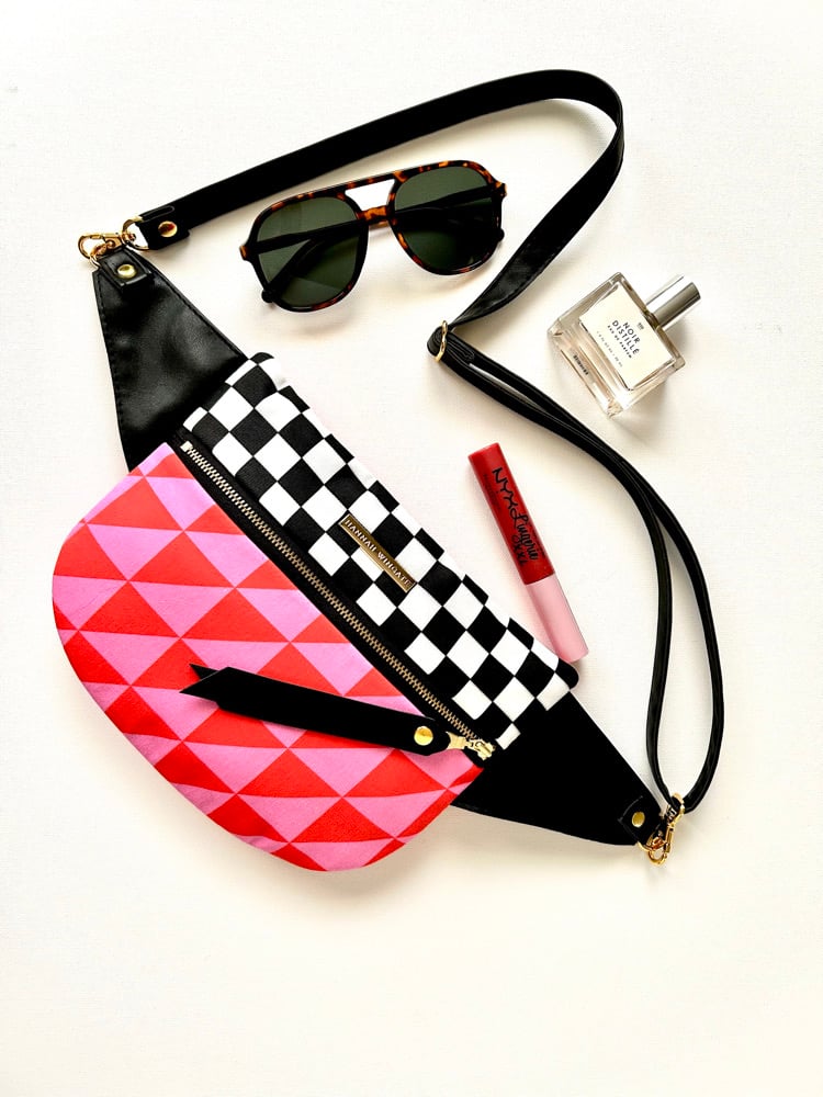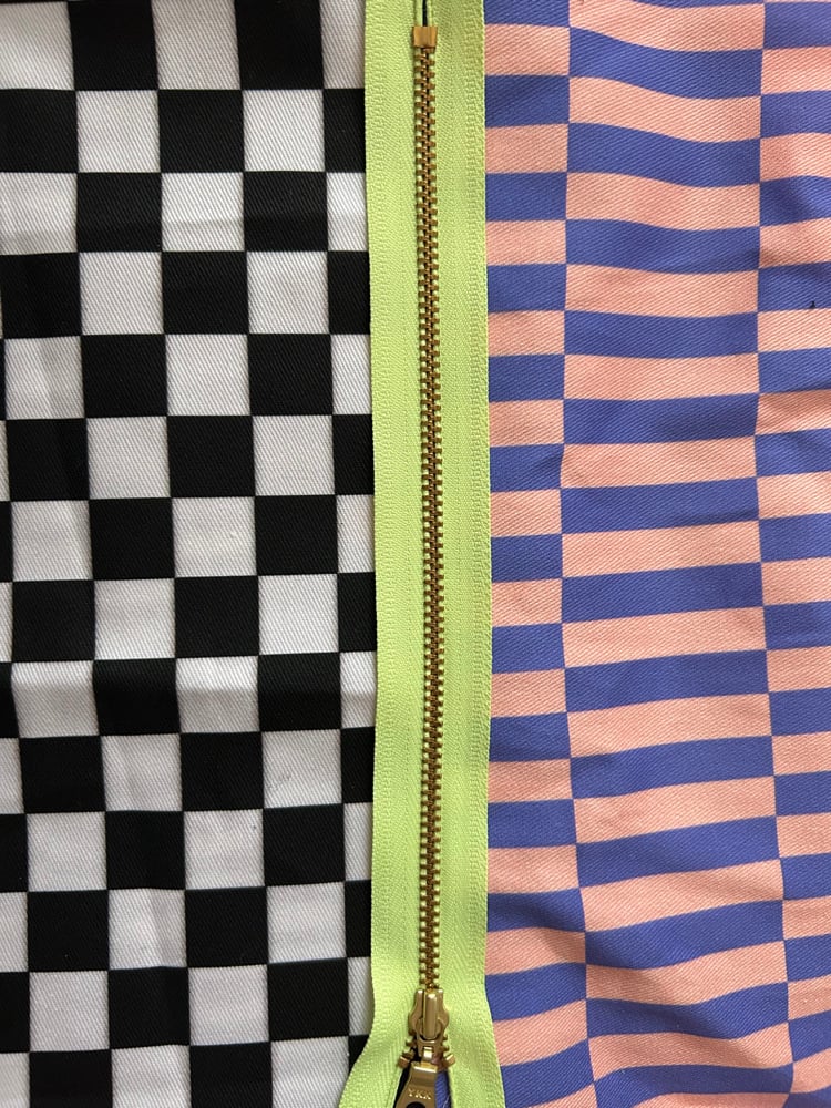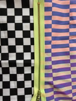 • B&W checkered print fabric mixed with peach and periwinkle stripes